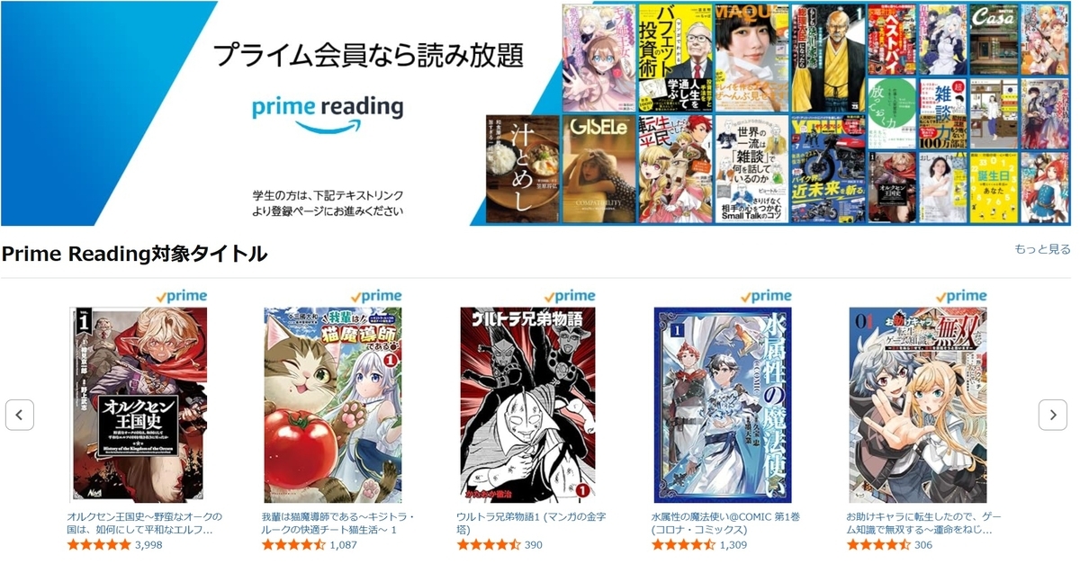 これ、意外と知られていませんが、書籍紹介画像や金額表示の近くに「prime」の表記があるKindle書籍は、「primeリーディング」というサービスの対象で、Amazonプライム会員なら無料で読むことができます。